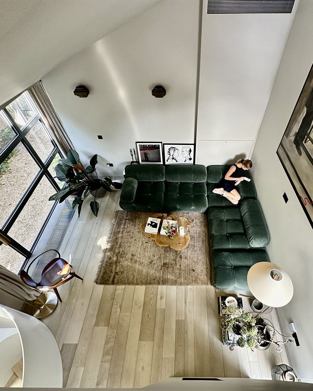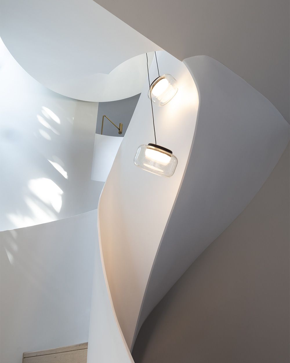 The heart of the house is a custom-made helical staircase in solid steel, connecting the entrance floor to the double-height living room on the second floor, up to the kitchen and dining area on the top level. Its fluid and enveloping geometry unites the common spaces in a continuous movement, creating a sculptural vortex of light and space. Here,