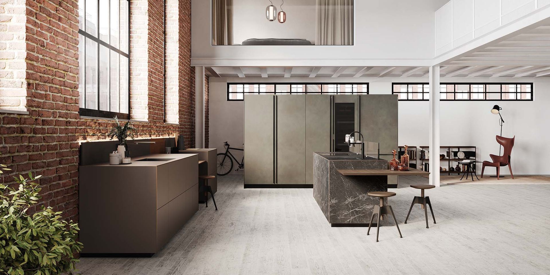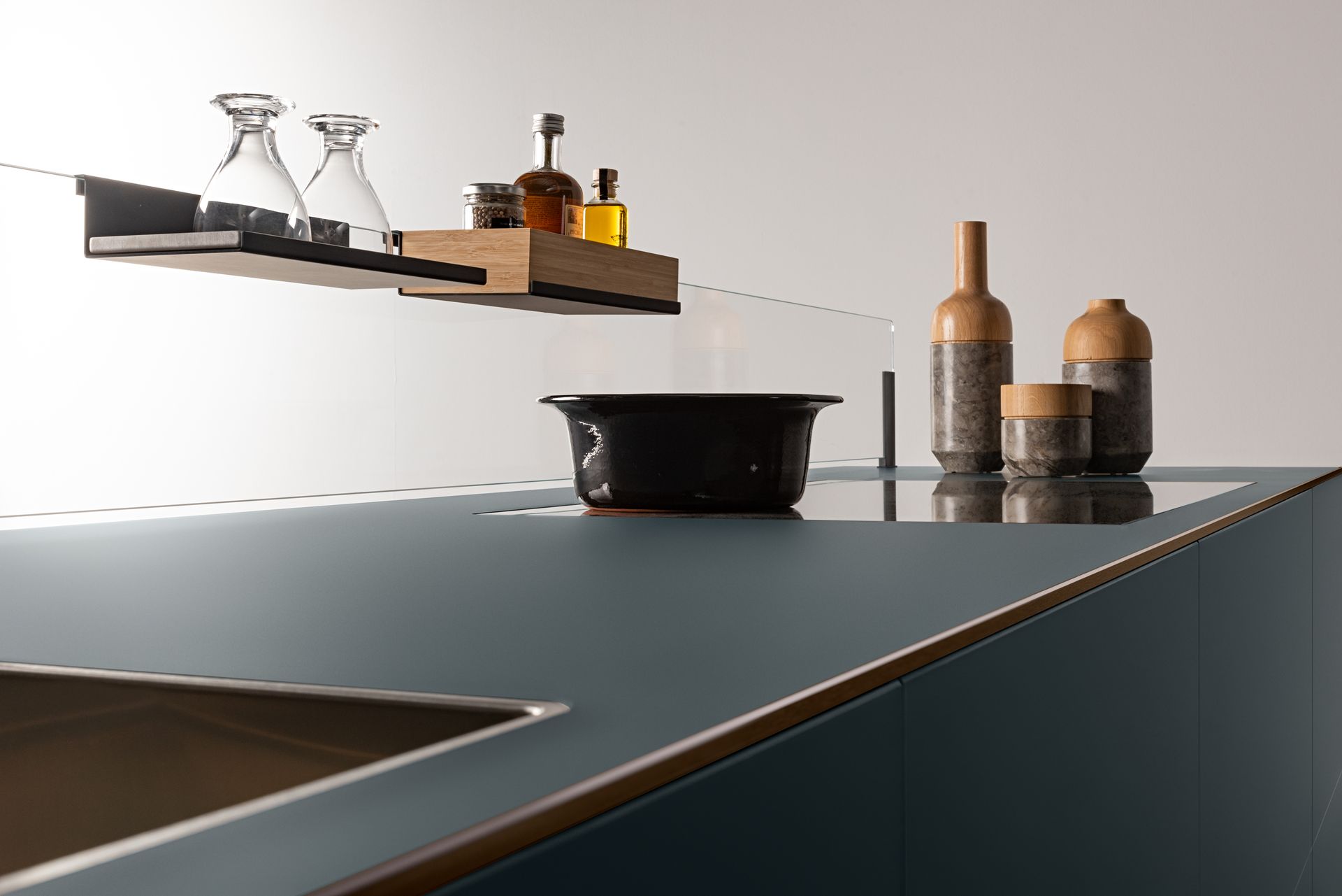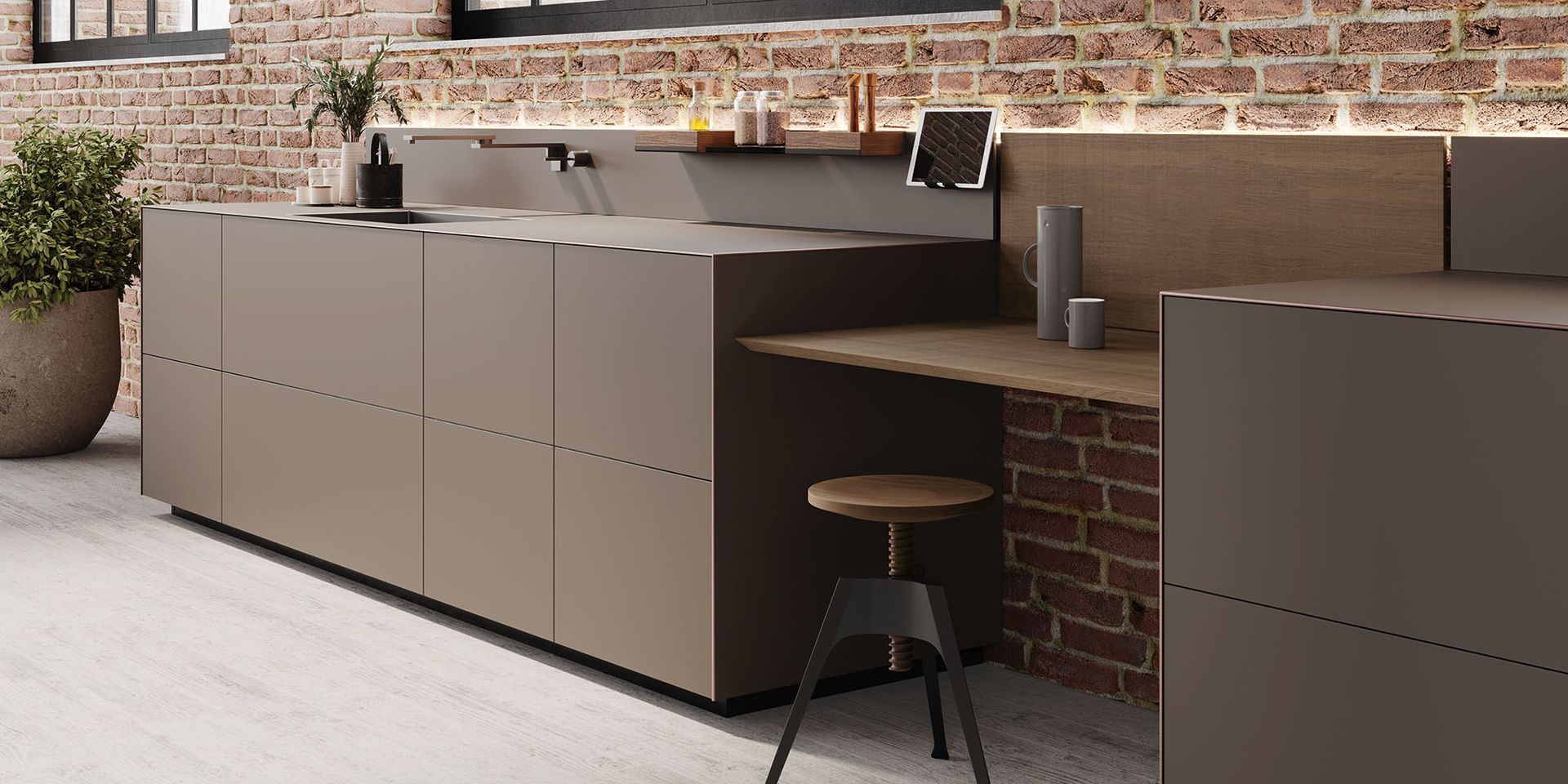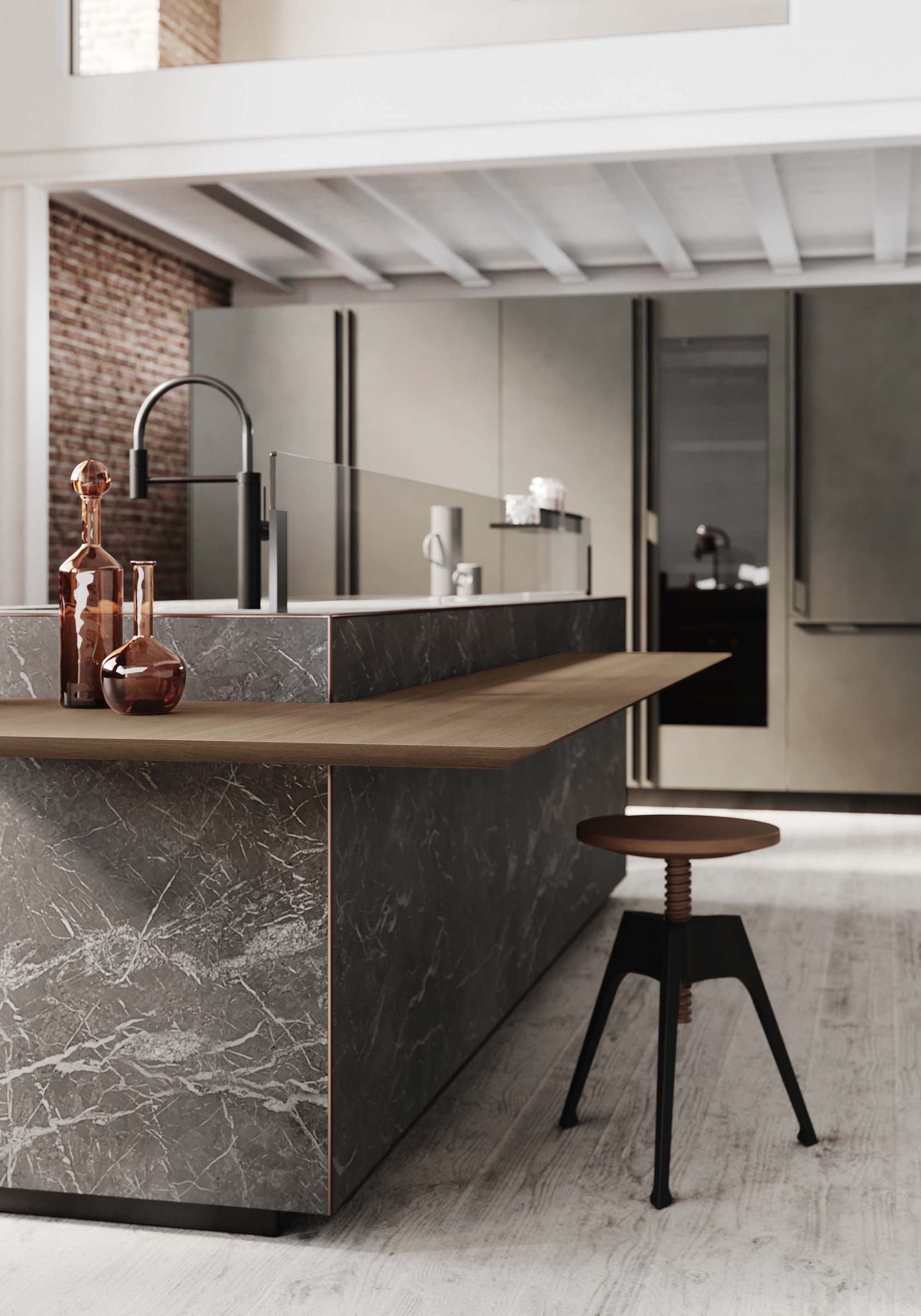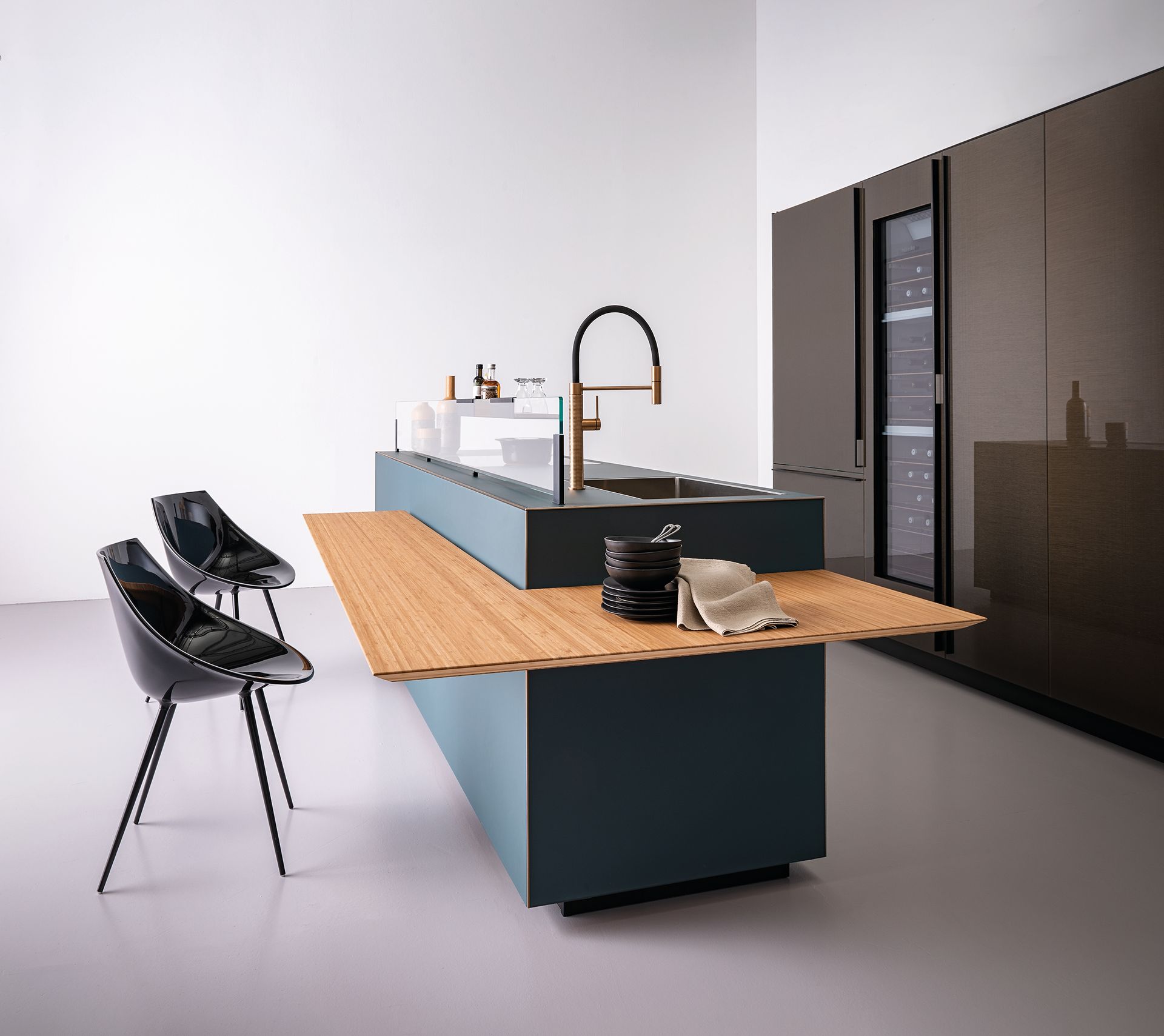 The result of creative research aimed at achieving a pure volume, Artematica Soft Outline kitchen looks like a single block in which the top, doors and side panels are integrated in a harmonious, continuous whole embellished with a metal profile. The “pure volume” effect of Artematica Soft Outline can be created with some finishes such as Vitrum – Valcucine glass in glossy and matt versions – ceramic, marble and the revolutionary Carbontec sintered stone. The delicate, curvy line that runs along the kitchens edges defines its volume. As well as highlighting the seamlessness of its surfaces, this line compliments the image of the kitchen with refined elegance. Its clean, minimalist design is the result of advanced creativity and precise and careful processing techniques. Made using cutting-edge technologies, the slim anodized aluminium profiles – available in black, copper and bronze – become stylistic details that add refinement to the arrangement. Our search for new means of expression that enhance the perception of a pure volume produces a poetically elegant space in which rigour and softness meet in fine balance. To complete the kitchen layout is the new Insula bamboo counter with a tapered profile and rounded corners in line with the sinuosity of the Soft Outline profile. The 30° chamfer on the perimeter of the table allows to perceive the edge that is just 6 mm thick. The peculiar fixing system through special brackets allows to create a gap between the breakfast bar itself and the base unit’s volume, giving an additional feeling of lightness.