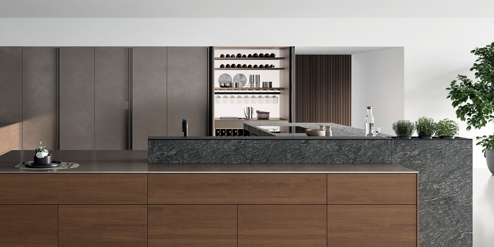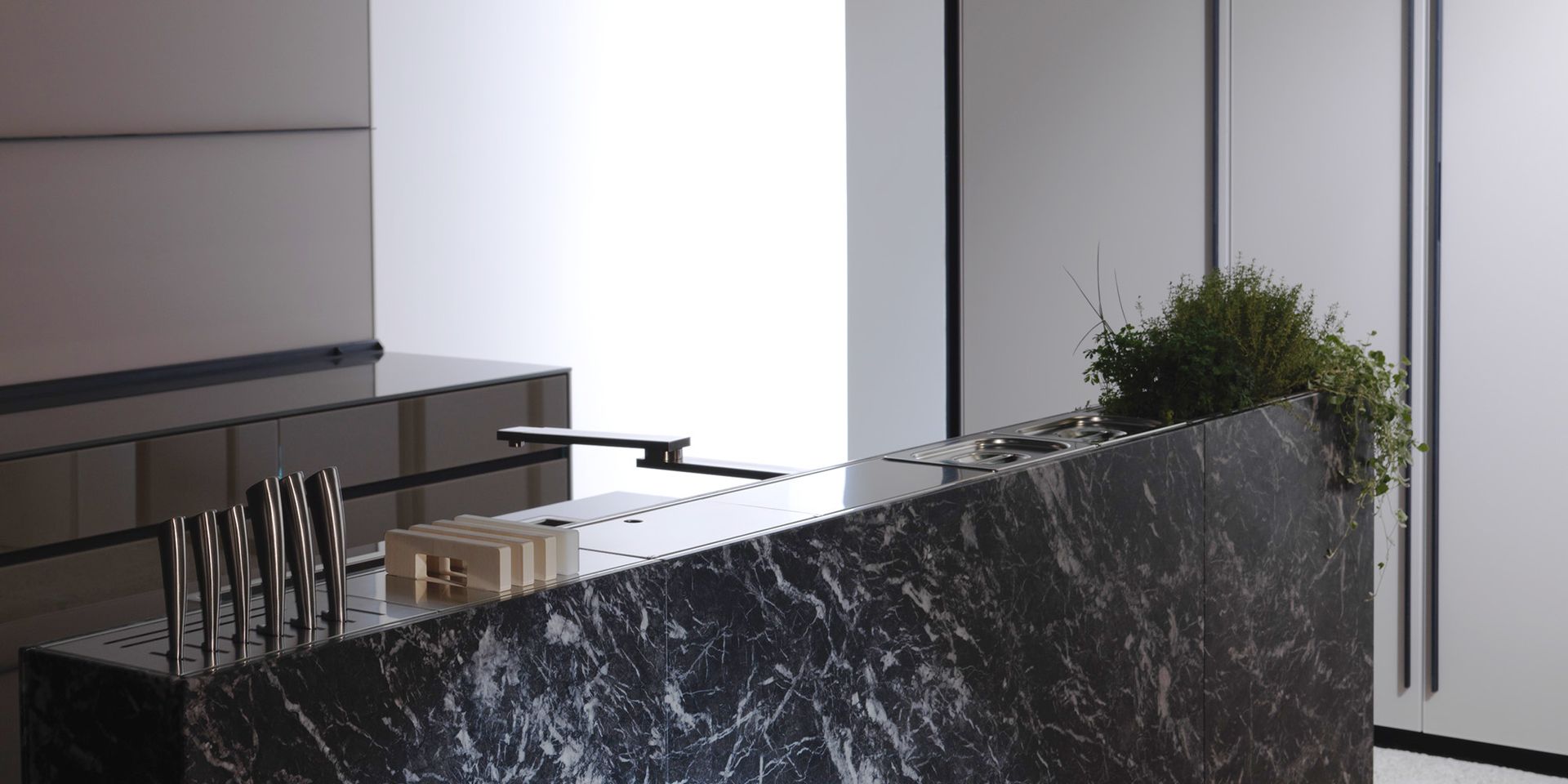 In the design of wall kitchens, the rear part of the countertop is typically not adequately utilized. Valcucine was the first to revolutionize kitchen ergonomics by increasing the depth of the countertop from the traditional 60/65cm to 80cm with the introduction of the Steel back section and the Logica Theca. The 80cm depth offers the possibility to work in a more open space, away from corners and wall cabinets, eliminating the feeling of constraint, providing greater freedom of movement, and improving the view of the countertop, which is used across its entire surface. This space, even in island designs, is further enriched by the inclusion of practical and functional containers that seamlessly integrate with the countertop and can accommodate small appliances, scales, cutting board sets, rolling pins and knife racks, electrical outlets, various kitchen utensils, and shelves for objects: visible on the Steel back section or concealed within the Logica Theca.