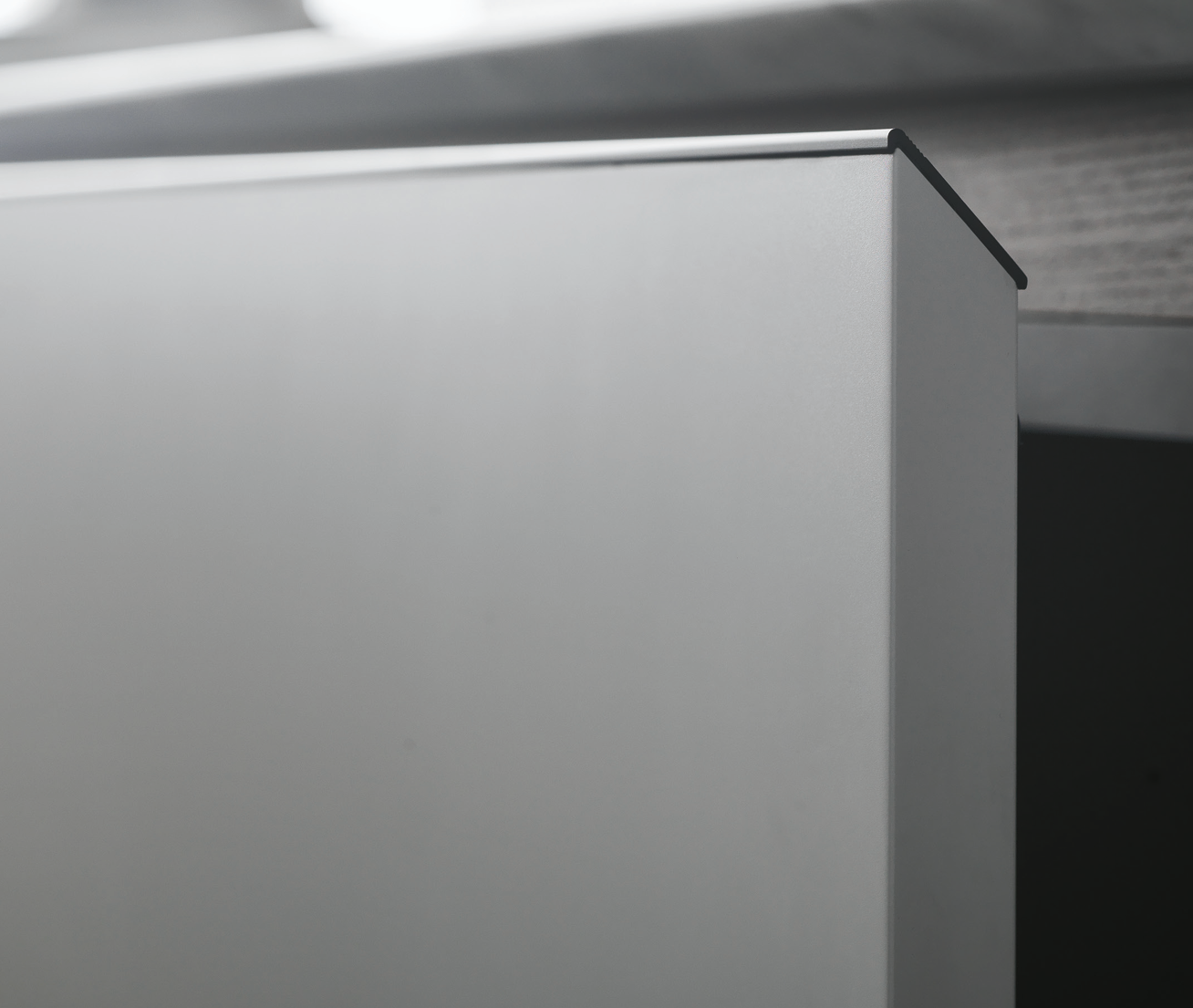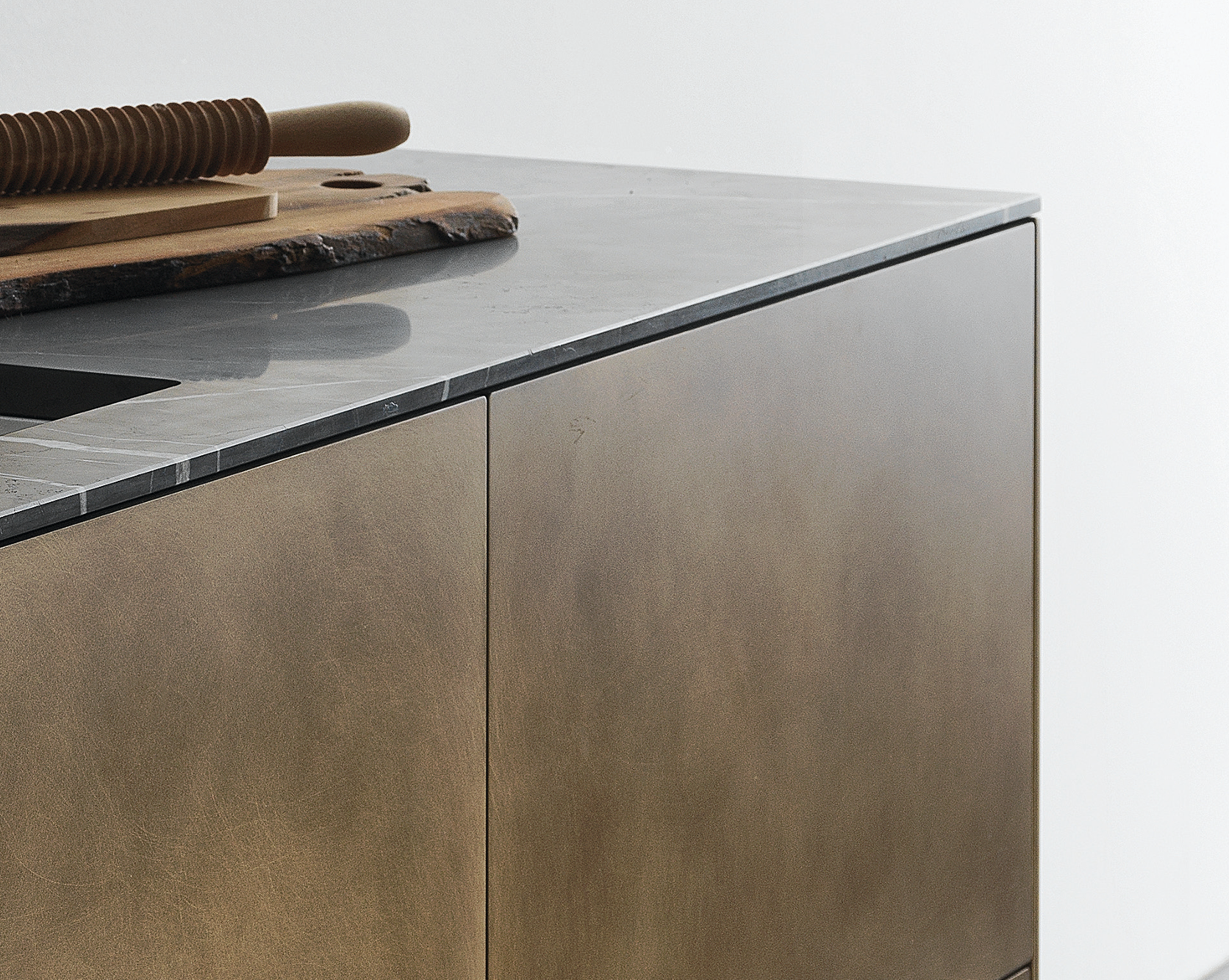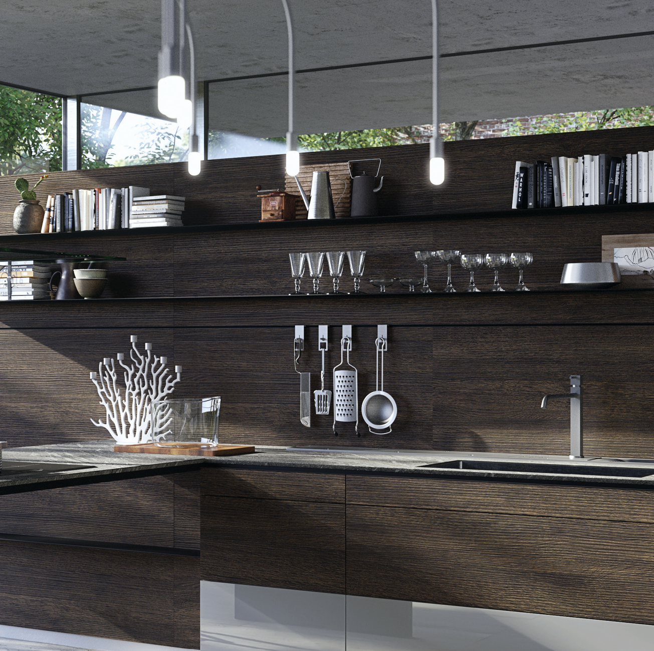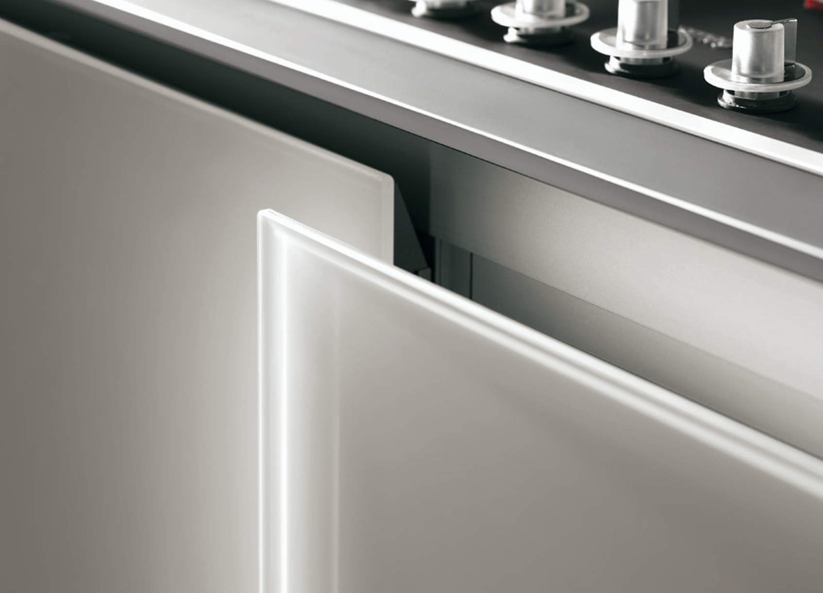 Tactile perceptions reveal ancestral, protective and reassuring emotions because they are more powerful and have a deeper impact than visual images. This is the feeling we want to convey through the smooth transparency of glass, the warmth of wooden kitchens, the versatility of laminate tops, the resistance of stone and the unique thrill aroused by steel cabinets.
