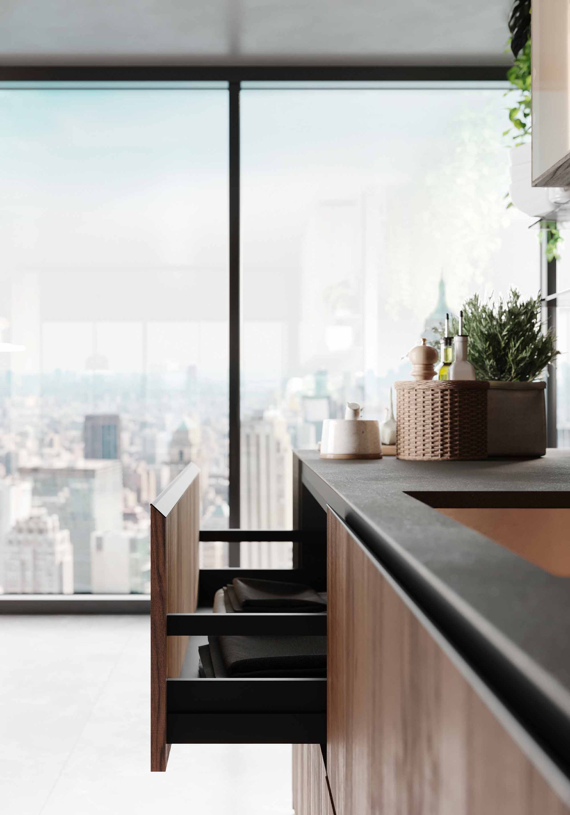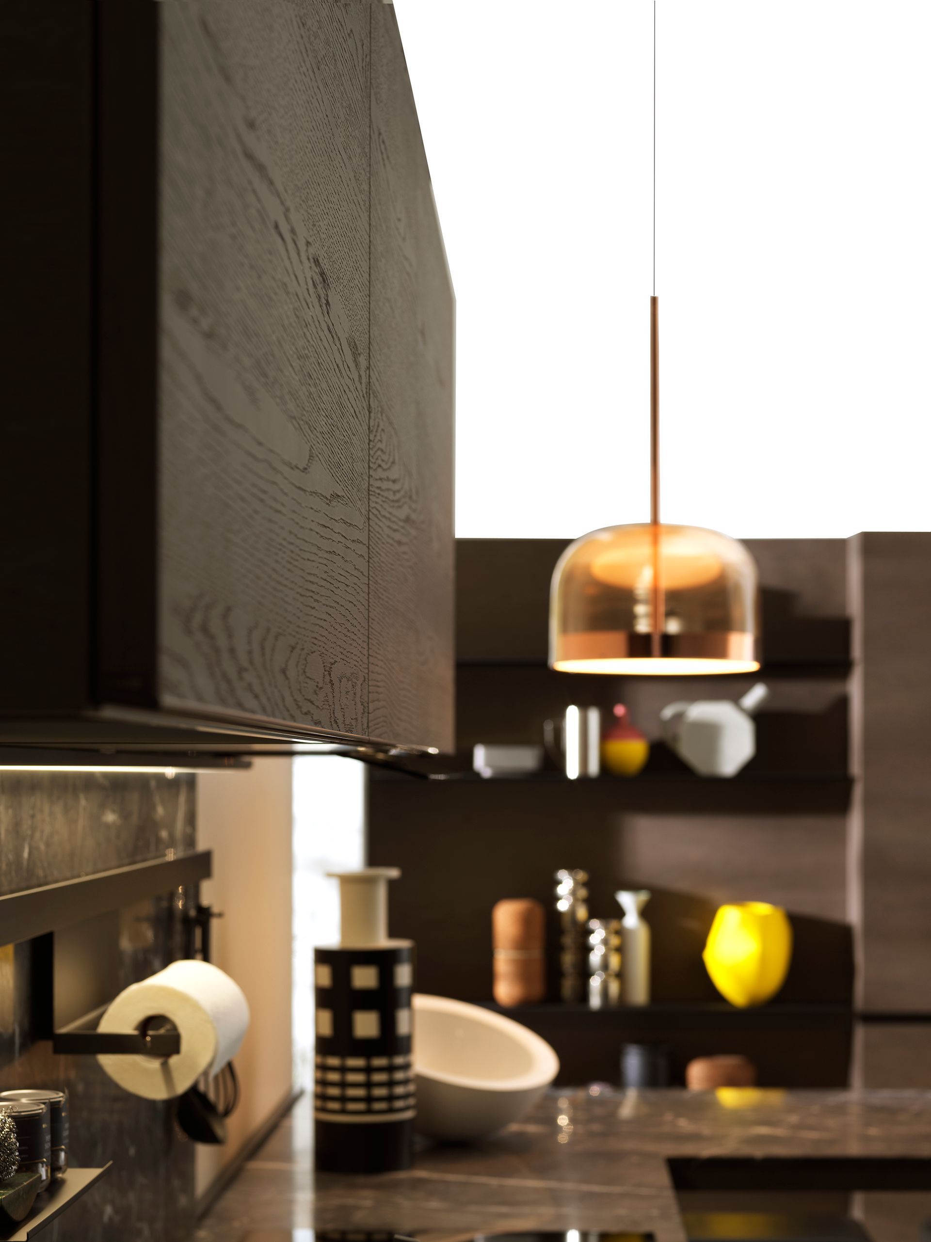 The most traditional of Valcucine kitchens, where elegance and practicality blend in perfect harmony without sacrificing details and technical solutions in line with the company’s philosophy. Tools, functions, and accessories are entrusted to large containment walls, dedicated paneling, and the equipped channel Logica Theca, remaining perfectly hidden. The distinctive design of the Origami breakfast counter conveys additional lightness and functionality to the composition. Everything contributes to creating a design layout where natural elements and technological solutions integrate into a harmonious and refined whole.