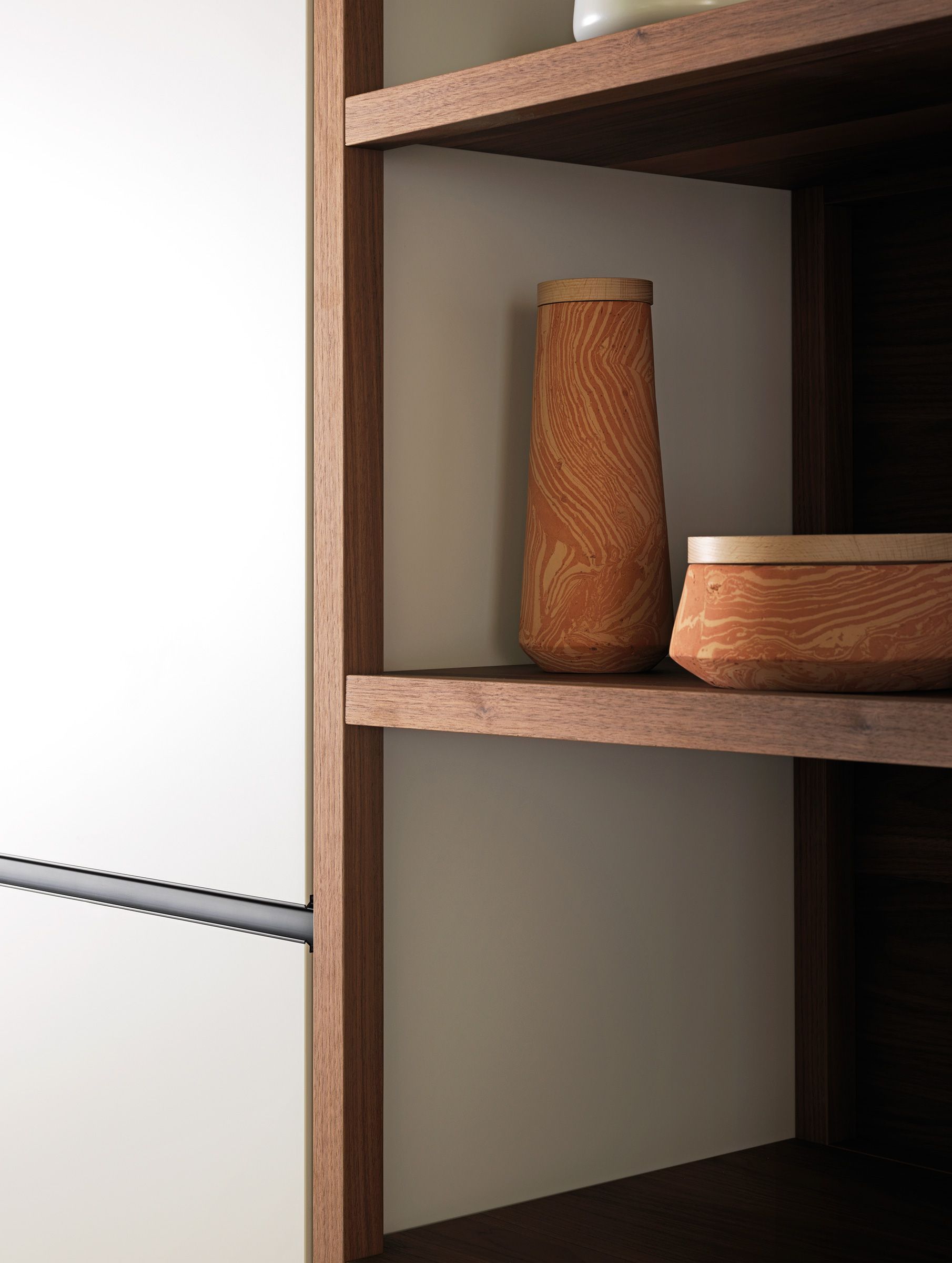 The distinctive traits of this arrangement are its formal simplicity and the minimalism of its lines which contribute to defining a clean-cut, elegant whole. Functionality is always guaranteed. Utensils, functions and accessories are located in large storage units against the wall, on dedicated wall panelling and perfectly hidden away in the Logica Theca equipped back section. The original design of the Origami breakfast bar lends even more lightness and functionality to the arrangement. Everything contributes to creating a designer layout in which natural elements and technological solutions are integrated in a harmonious whole, allowing the kitchen to create a strong bond with the natural environment surrounding it.