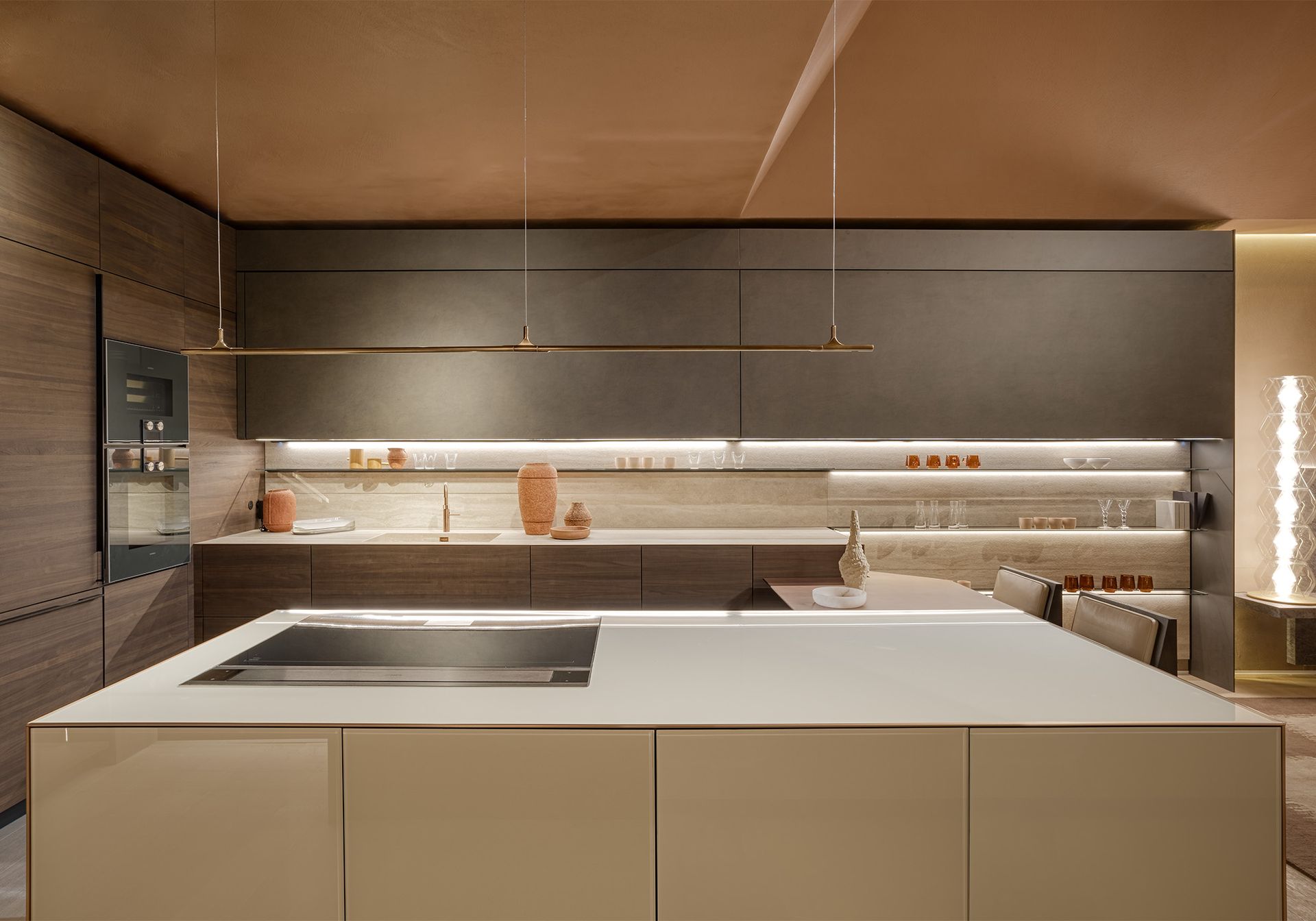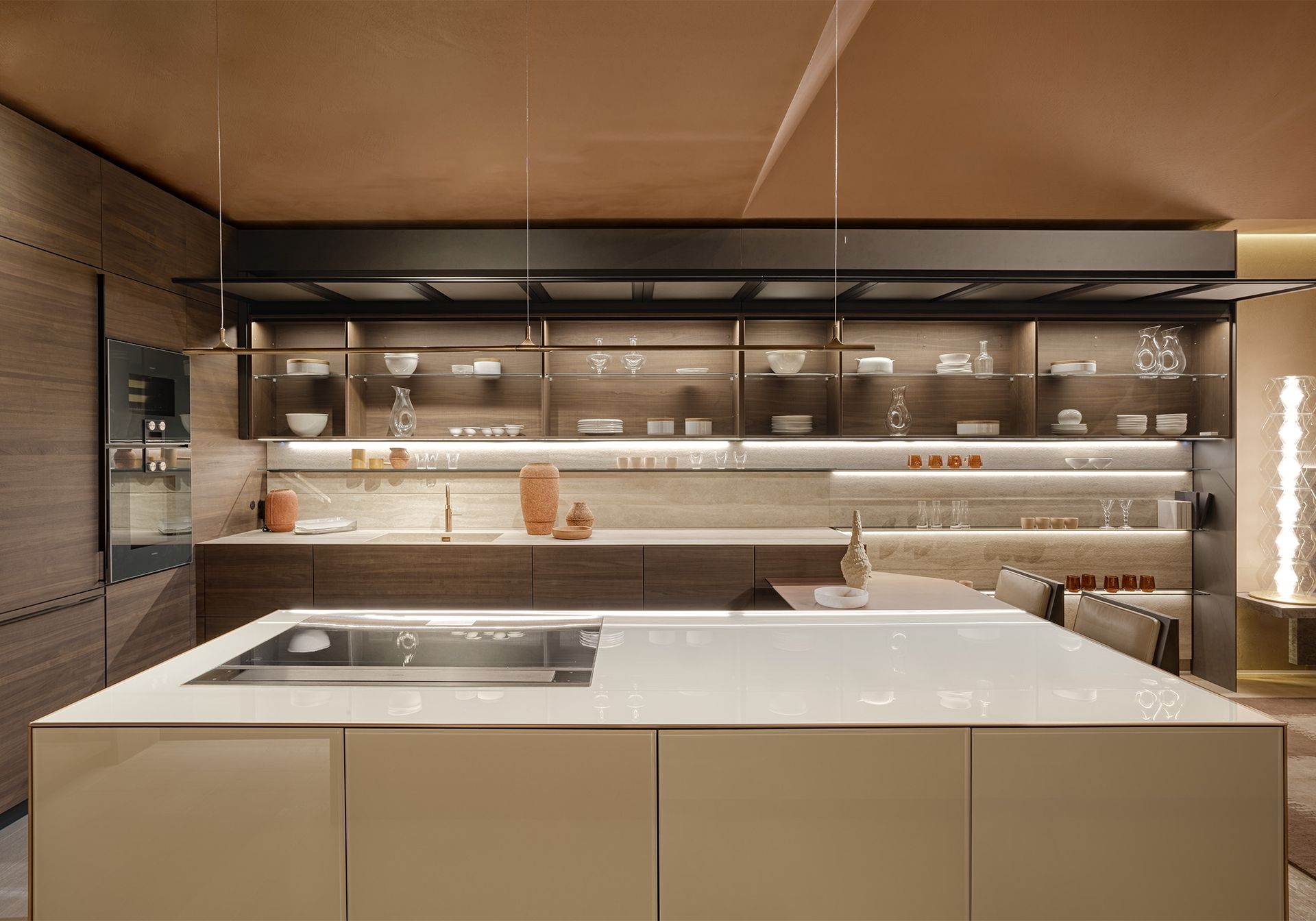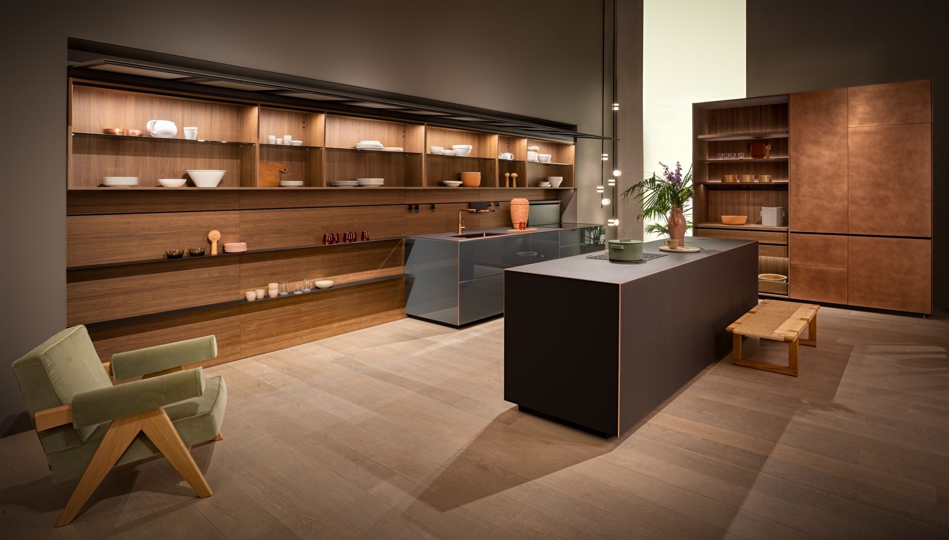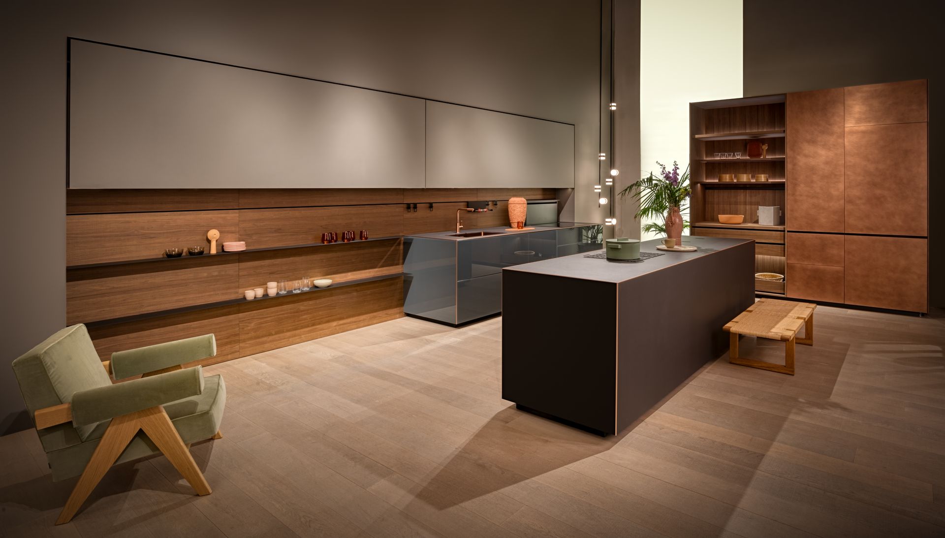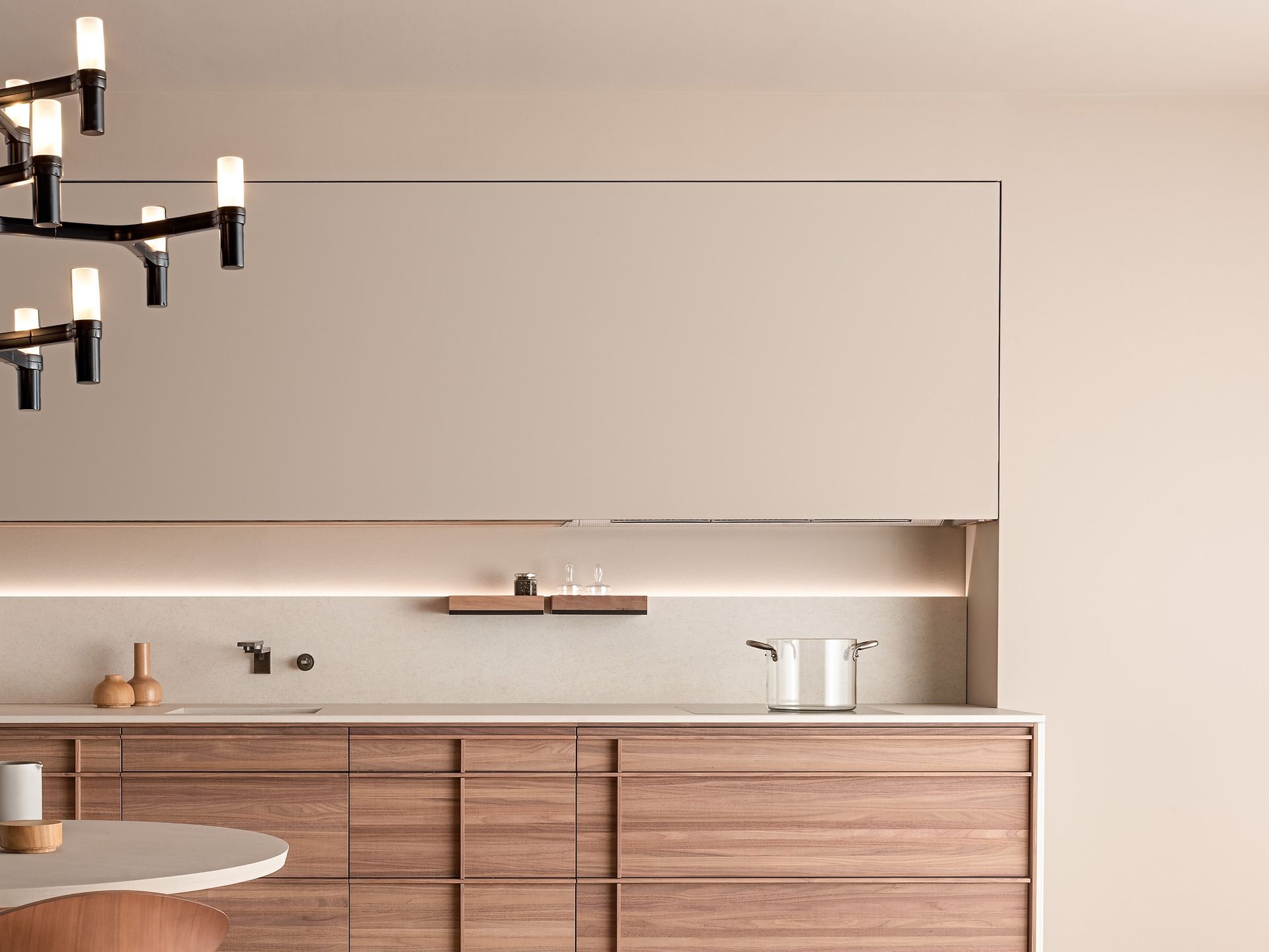 Vela is the name of a new, lightweight and silent, lift-up-and-over-door whose movement is made possible by a concealed balancing mechanism. This design choice enhances the extremely clean lines of the whole unit while favouring functionality. The door opens with surprising lightness, without making a single noise, guaranteeing optimal access to the content of the cabinet and perfect visibility even when it is all of 3 metres wide, i.e. its maximum size. This new door is available in all our HPL and Fenix® laminate finishes. Some of these can even be used to cover the walls adjacent to the unit, creating a large, uniform and seamless surface. The wall unit then becomes a piece of furniture that is perfectly integrated with the architecture of the home.