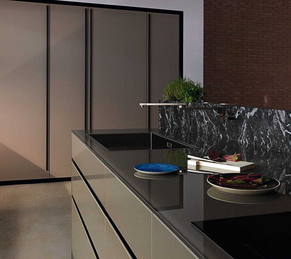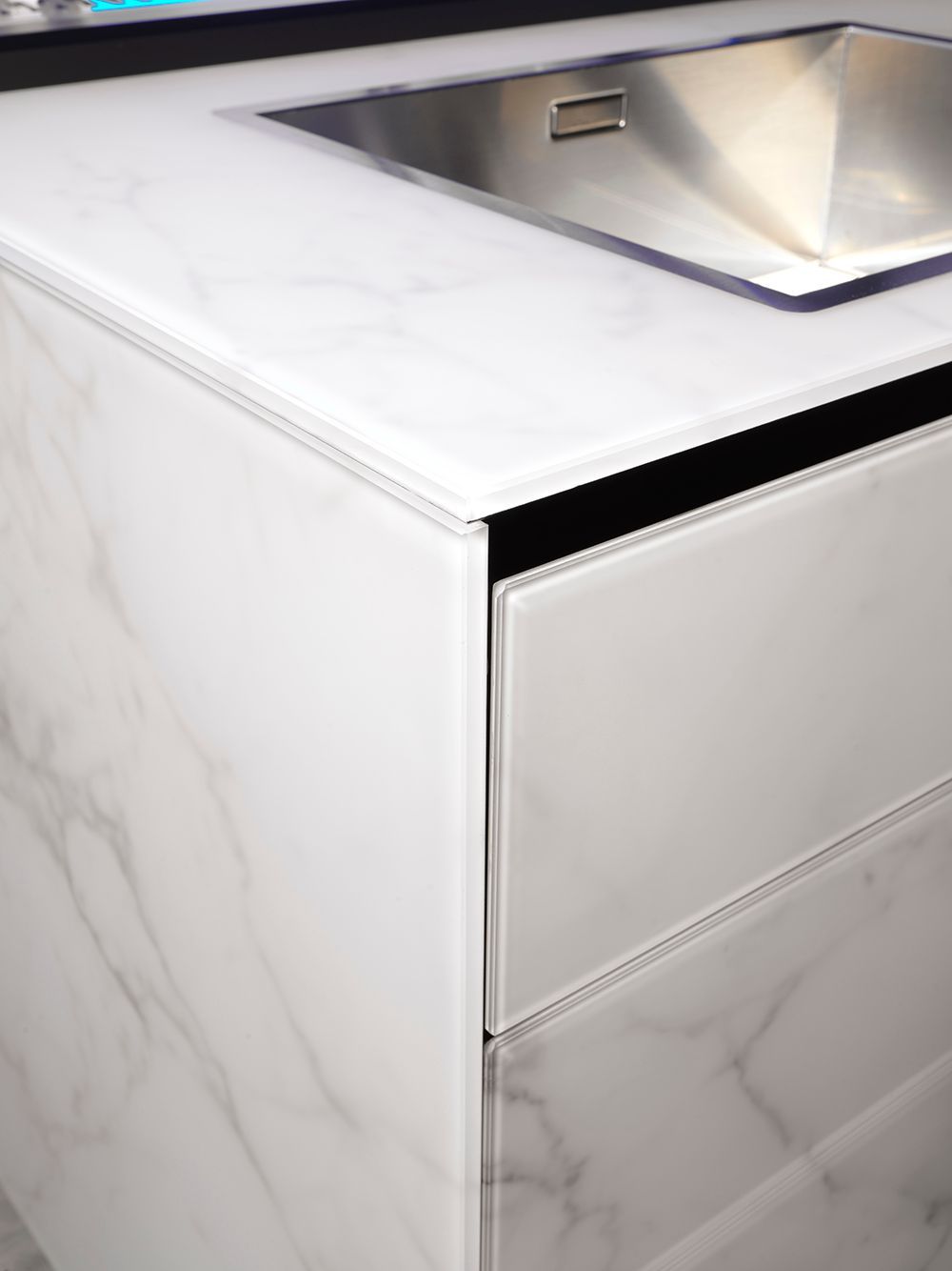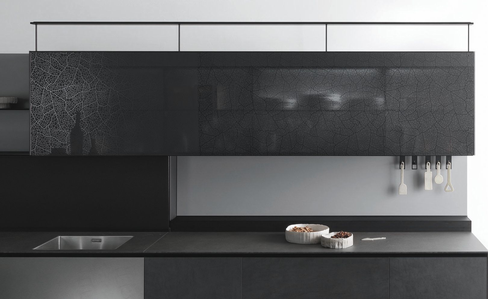 Valcucine was the first to use glass in kitchens, opening revolutionary perspectives rich in charm and technology. Noble and precious, glass is a material of strong expressiveness. It appears fragile but is actually resistant, capable of conveying sensations of unexpected and astonishing lightness. Glass is explored in its infinite possibilities, playing continuously with colors and surprising tactile suggestions. Through a tempering process, glass becomes five times stronger and safer, breaking into tiny non-sharp pieces if shattered. In addition to its durability, glass is eco-friendly