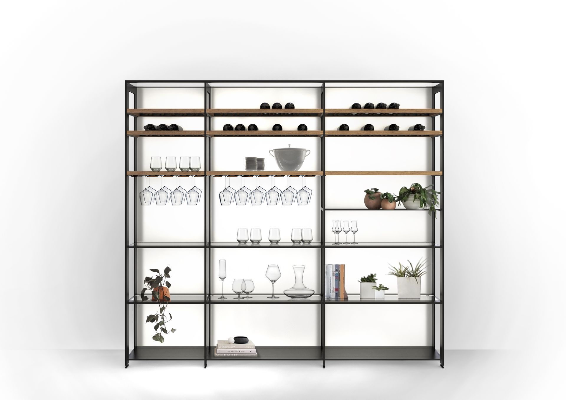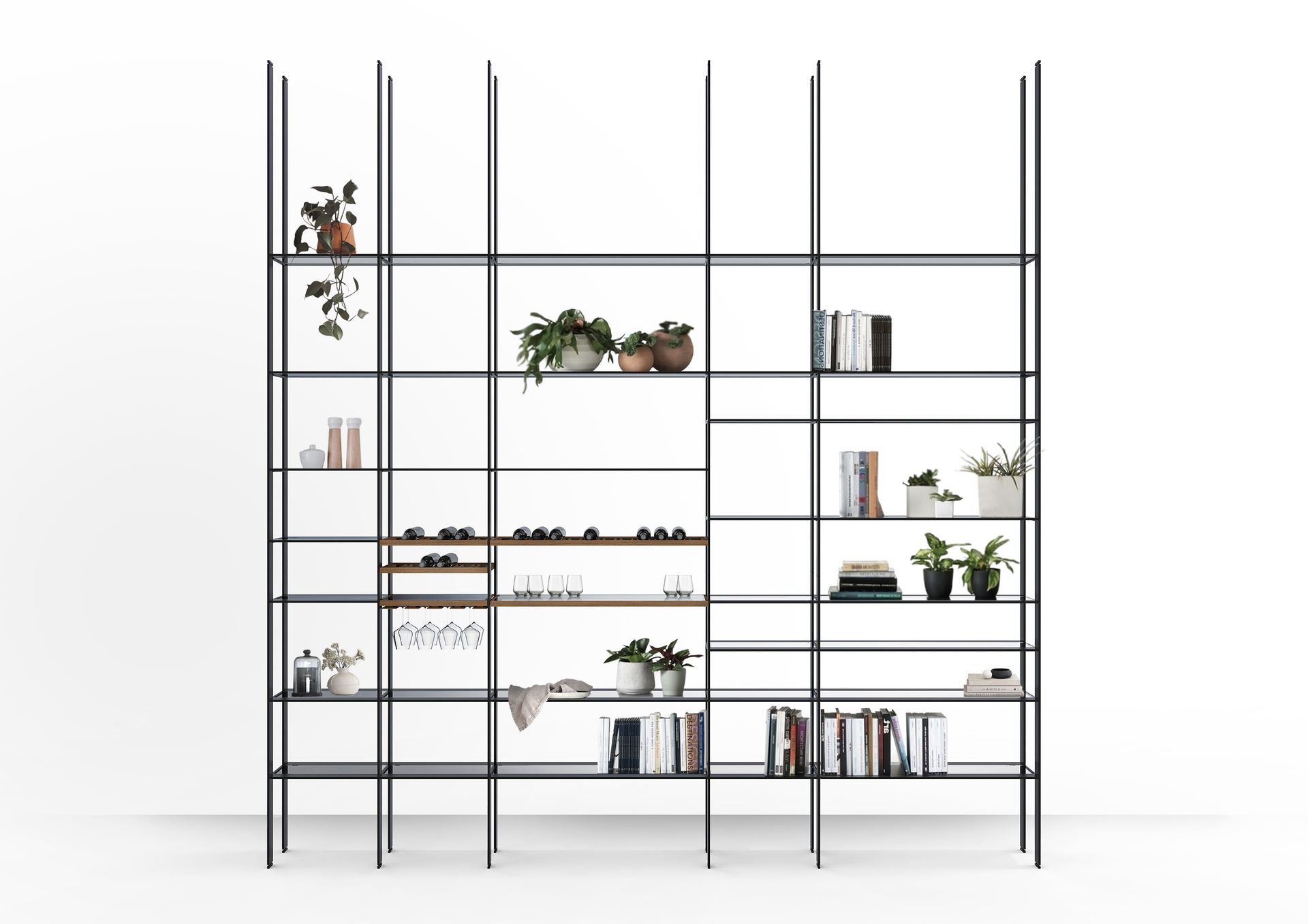 To respect the principle of dematerialisation, its structure is made up of vertical uprights in black anodised aluminium paired with elegant Gloss Smoky Grey Vitrum Velato shelves for a refined colour effect that adds personality to any room.
