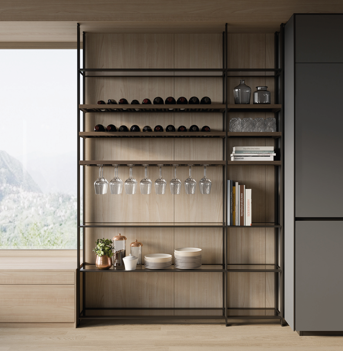 Designed to divide spaces between different environments or optimize storage spaces within the kitchen area, Valcucine Wall shelving units are available in various finishes and colors: black anodized aluminum, Tactile Wood, or Glossy and Matte Lacquer. Whether mounted on the wall or freestanding in aluminum or wooden finishes, or lacquered, their modular structure allows them to be configured to meet various design and functional needs.